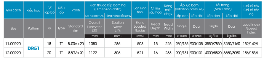 DR51 thiết kế tối ưu dành riêng cho xe khách. Lốp được cải tiến về kiểu hoa độc đáo với đơn pha chế mặt chạy chống cắt, băm vỡ,chống mòn cao, có khả năng kéo dài thời gian sử dụng của lốp. Mặt chạy của lốp được thiết kế 5 rãnh hoa rộng tối ưu cho tối đa hóa việc thoát nước, thiết kế các rãnh lồng vào nhau giúp bám đường ướt và cải thiện độ ổn định. Ngoài ra, các rãnh dọc độc đáo có khả năng chống kẹt đá, nứt rãnh hoa tốt, có khả năng lái và dẫn hướng ở vị trí lốp trước, có chức năng dẫn hướng dễ dàng.