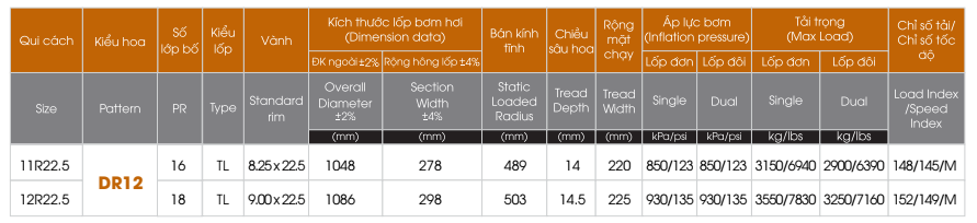 DR 12 có thiết kế kiểu hoa độc đáo với đơn pha chế mặt chạy chống cắt, băm vỡ, chống mòn cao, có khả năng kéo dài thời gian sử dụng của lốp. Hoạt động với các rãnh sipes tuyến tính tối ưu cho tối đa hóa việc thoát nước, cung cấp lực kéo trên đường ướt ổn định hơn. Các rãnh dọc zigzag độc đáo có khả năng chống kẹt đá, nứt rãnh hoa tốt, có khả năng lái và dẫn hướng ở vị trí steer dễ dàng.