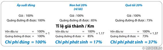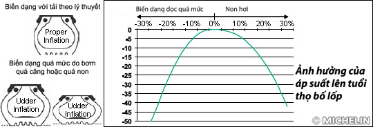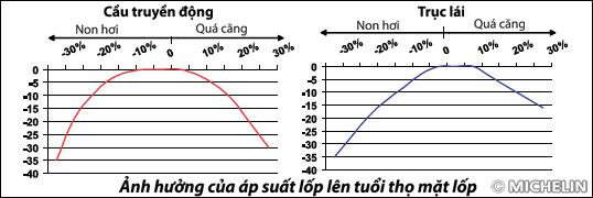 Áp suất bơm có ảnh hưởng trực tiếp đến hoạt động của lốp, cả về tuổi thọ, độ bền và chi phí phát sinh thêm. Các bạn có thể tham khảo những biểu đồ dưới đây: