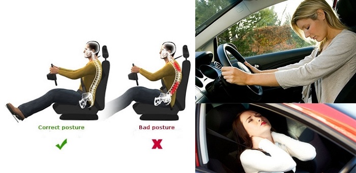 Cơ thể phải luôn áp sát vào lưng ghế với phần lưng áp sát vào tựa lưng ghế và phần mông áp sát sâu vào ghế. Nếu cơ thể áp sát vào ghế nhưng tay phải với tới vô lăng hay chân phải chòm tới bàn đạp ga/phanh thì cần chỉnh lại ghế ngồi chứ không phải cơ thể. Việc áp sát vào lưng ghế sẽ giúp cột sống được nâng đỡ, giảm áp lực, từ đó tránh tình trạng đau lưng khi ngồi lái xe nhiều.