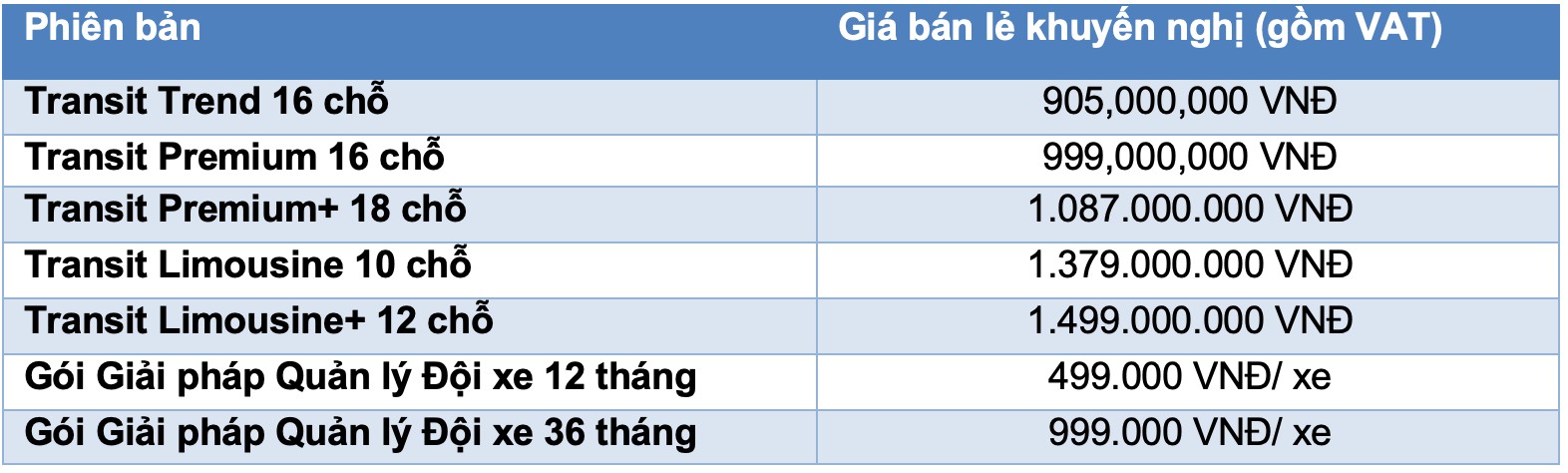 Ford Transit hoàn toàn mới phiên bản Trend và Premium sẽ được giao tới tay khách hàng vào đầu tháng 8/2024. Phiên bản Premium Plus dự kiến sẽ được giao tới tay khách hàng từ giữa tháng 9/2024 với giá bán như sau: