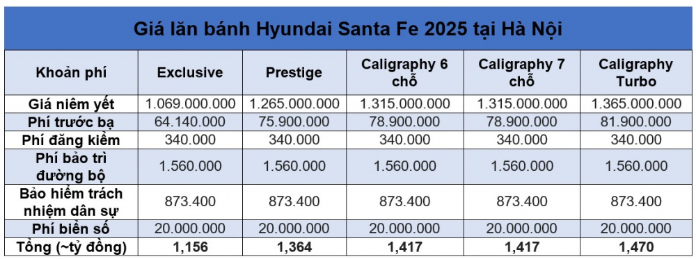 Giá bán lẻ khuyến nghị cho từng phiên bản Hyundai Santa Fe thế hệ hoàn toàn mới như sau (đã bao gồm thuế VAT): Exclusive giá 1,069 tỷ; Prestige giá 1,265 tỷ; Calligraphy 6 chỗ và 7 chỗ giá 1,315 tỷ và cuối cùng là Calligraphy Turbo giá 1,365 tỷ đồng.