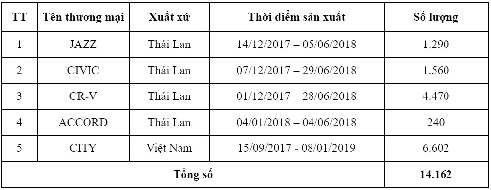 Thông tin các mẫu xe liên quan đến đợt triệu hồi này như sau: