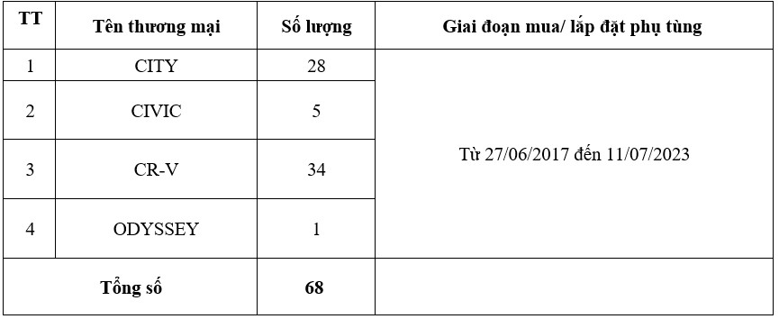 HVN xác định được 68 khách hàng sở hữu những xe kể trên không thuộc thời điểm sản xuất nêu trong mục (1) tuy nhiên được xác định đã có lịch sử thay thế phụ tùng bơm nhiên liệu cần được triệu hồi. Các nhà phân phối Honda Ôtô sẽ liên hệ trực tiếp với 68 chủ xe của danh sách này để thông tin và hướng dẫn trong thời gian sớm nhất.