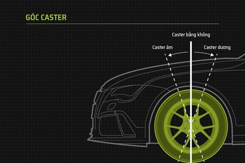 Góc caster là góc nghiêng của trục lái khi nhìn từ bên hông xe. Khi trục lái nghiêng về phía sau thì được gọi là góc Caster Dương (+) và góc Caster âm (-). thì ngược lại. Phần lớn các dòng xe du lịch đều có trục lái nghiêng về phía người lái hay còn gọi là góc Caster Dương (+).