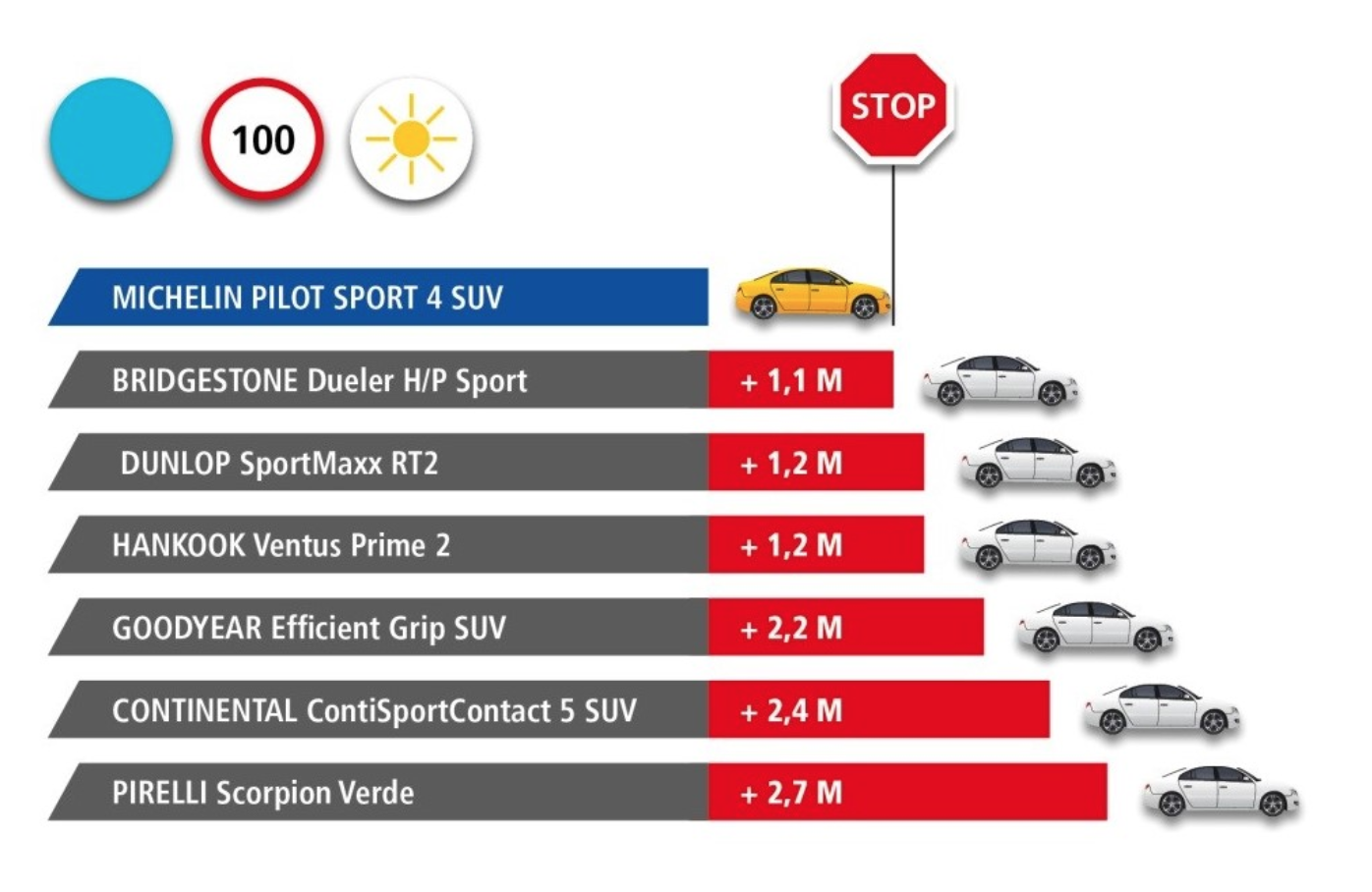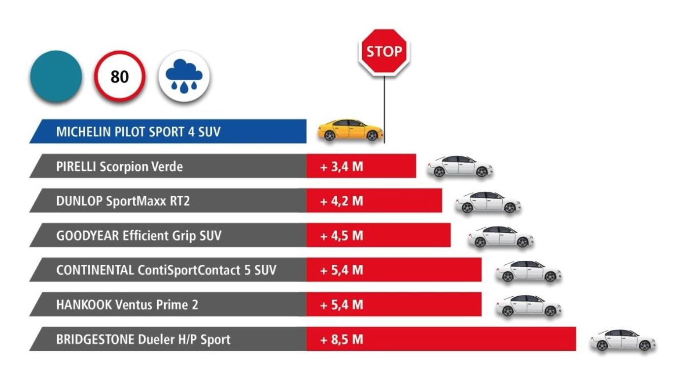 Với điều kiện đường ướt, chúng tôi được so sánh thực tế với lốp của thương hiệu Continental. Cả 2 đều được lắp trên chiếc BMW X3 đời mới, phanh ở tốc độ khoảng 80 km/h và Số liệu được thiết bị điện tử hiện đại đo đạc và không có sự can thiệp bởi con người. Kết quả, chiếc X3 dùng lốp Michelin Pilot Sport 4 SUV dừng lại trong khoảng cách từ 26 - 27m trong khi đối thủ là 28 - 29m. Trong những trường hợp khẩn cấp và nguy hiển, khoảng các chênh lệch như thế này đủ để phòng tránh những trường hợp tồi tệ xảy ra.