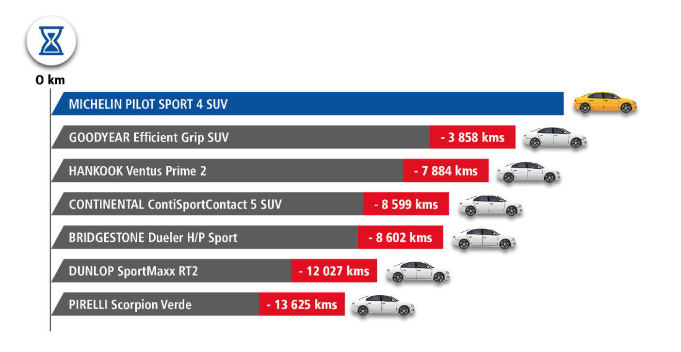 Về tuổi thọ của lốp, các chuyên gia nước ngoài sau khi sử dụng và so sánh với các đối thủ, Michelin Pilot Sport 4 SUV cũng có thời gian sử dụng vượt trội.