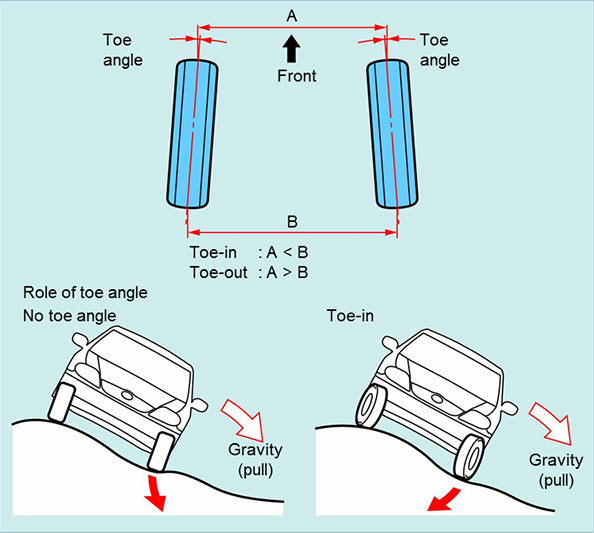 Toe là khoảng cách giữa hai má lốp đo từ phía trước và khoảng cách hai má lốp đo từ phía sau, đây chính là độ chụm của bánh xe. Độ chụm chuẩn thường bằng 0.