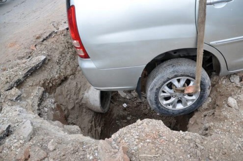 Khi bạn di chuyển trên tuyến đường mà mặt đường bị lòi lõm hay còn gọi là ổ gà, thì đây chính là thứ sẽ "giết" chết lốp xe ôtô ngay lập tức, thậm chí nó còn phá hủy luôn cả bộ mâm xe của bạn nếu như bạn vẫn ngoan cố đi trên đoạn đường như thế.