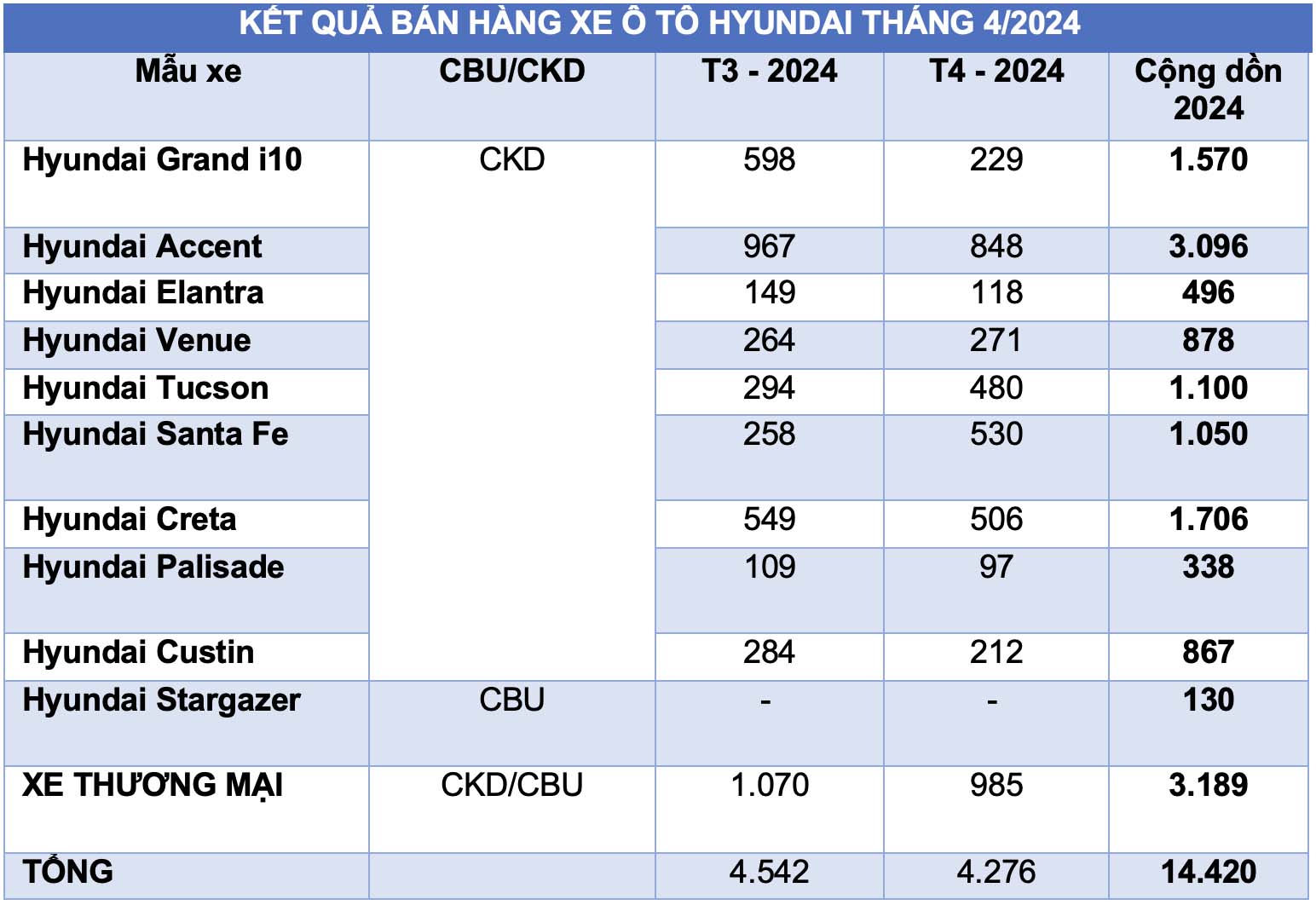 Doanh số bán hàng các mẫu xe Hyundai trong tháng 4/2024 và doanh số cộng dồn từ đầu năm đến nay (Đơn vị: Xe):