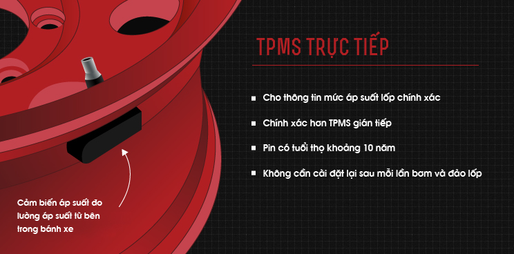 TPMS trực tiếp sử dụng cảm biến đo lường áp suất ở mỗi lốp giúp đo các mức áp suất nhất định chứ không chỉ đo số vòng quay của bánh từ hệ thống chống bó cứng phanh.