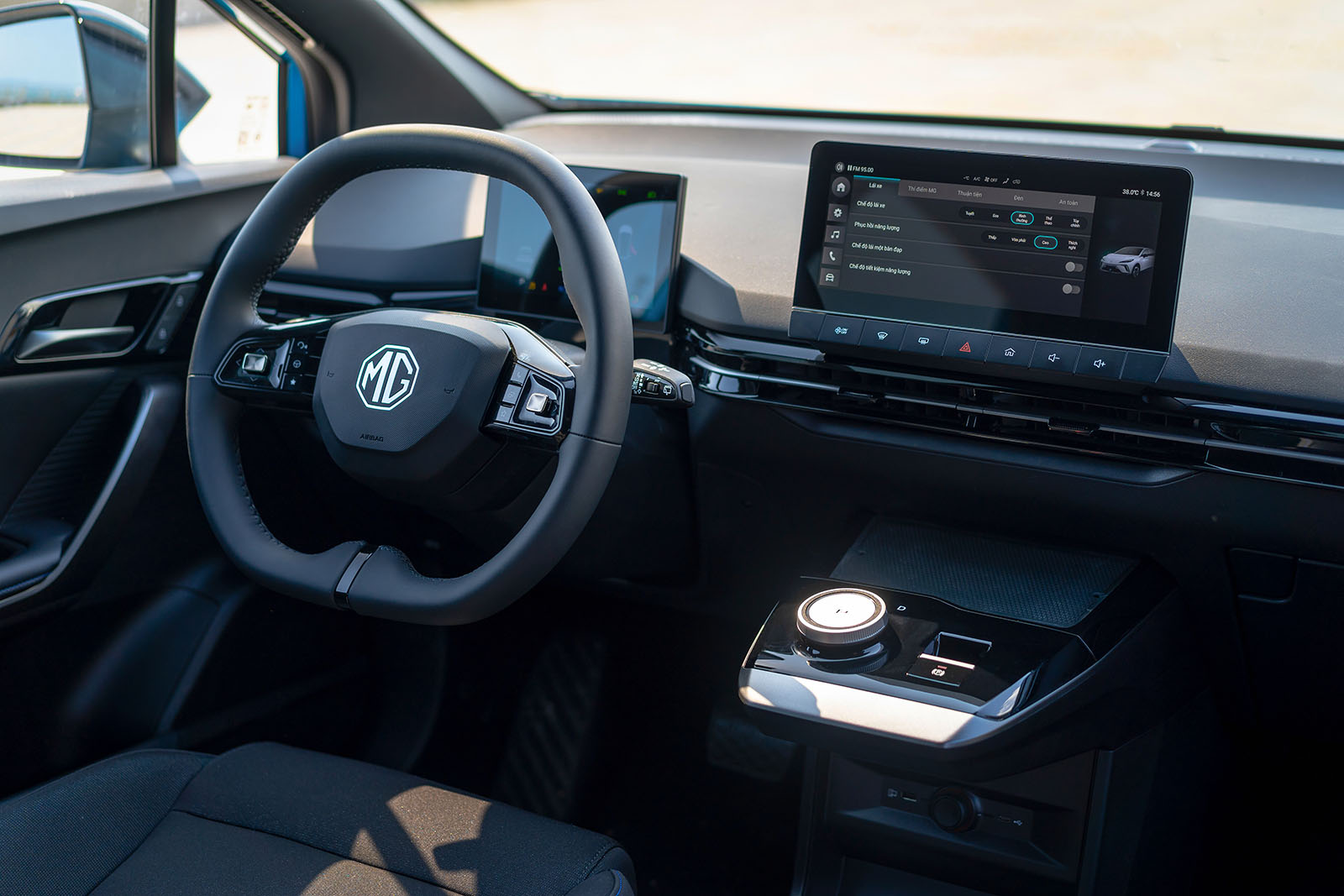 MG4 sở hữu không gian nội thất rộng rãi, với khoảng trống đầu lớn nhờ vào thiết kế pin mỏng chỉ 110 mm. Các tính năng nổi bật bao gồm màn hình giải trí cảm ứng 10,25-inch, hỗ trợ Apple CarPlay và Android Auto, giúp người lái dễ dàng kết nối và truy cập thông tin. Vô-lăng hai chấu dạng D-cut bọc da cao cấp, tích hợp các nút điều khiển tiện lợi, mang lại cảm giác thể thao.