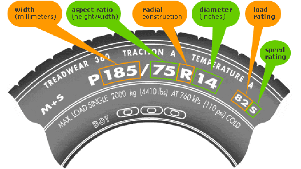 75 – Tỷ số giữa độ cao của thành lốp (sidewall) với độ rộng bề mặt lốp: được tính bằng tỷ lệ bề dày/ chiều rộng lốp. Trong ví dụ trên đây, bề dày bằng 75% chiều rộng lốp (185)