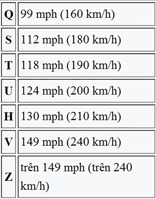 Tốc độ tối đa của lốp có thể tra trong bảng: